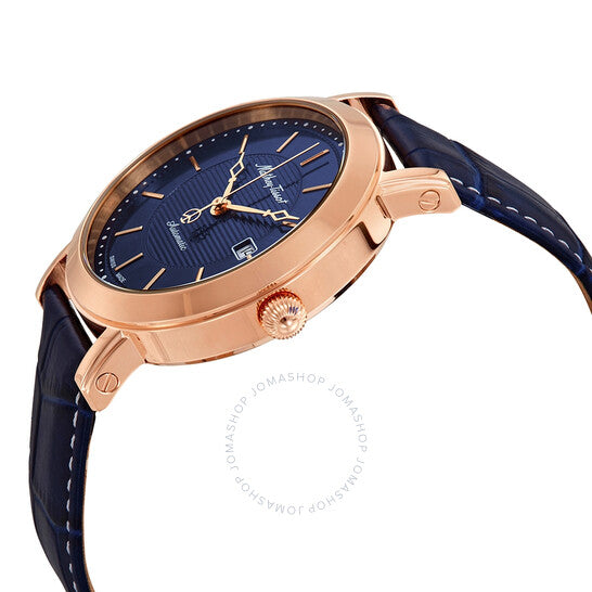 علبة من الفولاذ المقاوم للصدأ مطلية بالذهب الوردي بتقنية PVD مع سوار جلدي أزرق. إطار ثابت مطلي بالذهب الوردي بتقنية PVD. ميناء أزرق مع عقارب وعلامات ساعات ذهبية وردية اللون. علامات دقائق حول الحافة الخارجية. نوع الميناء: تناظري. عرض التاريخ عند موضع الساعة 3. حركة أوتوماتيكية عيار STP STP1-11، مبنية على ETA 2824-2، تحتوي على 26 جوهرة، تنبض بمعدل 28800 ذبذبة في الساعة، ولديها احتياطي طاقة لمدة 44 ساعة تقريبًا. زجاج معدني مقاوم للخدش. تاج قابل للسحب/الدفع. غطاء خلفي شفاف. شكل دائري. حجم العلبة: 41 مم. سمك العلبة: 11 مم. عرض السوار: 17 مم. مشبك تانغ. مقاومة للماء حتى عمق 50 مترًا / 165 قدمًا. الوظائف: التاريخ، الساعة، الدقيقة، الثانية. تصميم ساعة كاجوال. علامة الساعة: صناعة سويسرية. ساعة ماثي تيسوت سيتي أوتوماتيكية للرجال بمينا زرقاء HB611251ATPBU.