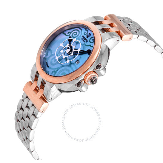 علبة من الفولاذ المقاوم للصدأ بسوار من الفولاذ المقاوم للصدأ ثنائي اللون (فضي وذهبي وردي). إطار ثابت من الذهب الوردي. ميناء أزرق من عرق اللؤلؤ مع عقارب سوداء. نوع الميناء: تناظري. عرض التاريخ عند موضع الساعة 3. حركة أوتوماتيكية من عيار تيودور 2671 مع احتياطي طاقة لمدة 38 ساعة. زجاج من الياقوت المقاوم للخدش. تاج لولبي. غطاء خلفي صلب. شكل دائري. حجم العلبة: 30 مم. مشبك قابل للطي. مقاومة للماء حتى عمق 100 متر / 330 قدمًا. الوظائف: التاريخ، اليوم، الساعة، الدقيقة، الثانية. تصميم كاجوال. علامة الساعة: صناعة سويسرية. ساعة تيودور كلير دي روز أوتوماتيكية نسائية M35401-0009.