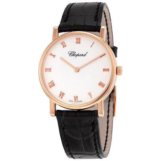 علبة من الذهب الوردي عيار ١٨ قيراطًا مع سوار أسود من جلد التمساح. إطار ثابت من الذهب الوردي عيار ١٨ قيراطًا. ميناء أبيض بعقارب من الذهب الوردي وعلامات ساعات بأرقام رومانية. نوع الميناء: تناظري. آلية حركة يدوية مع احتياطي طاقة ٤٢ ساعة. زجاج من الياقوت المقاوم للخدش. تاج لولبي. غطاء خلفي صلب. حجم العلبة: ٣٣.٦٠ مم. سمكها: ٥.٤١ مم. شكلها دائري. عرض السوار: ٢٠.٣ مم. طول السوار: ٨ بوصات. مشبك تانغ. مقاومة للماء حتى عمق ٣٠ مترًا / ١٠٠ قدم. الوظائف: الساعات، الدقائق. تصميم ساعة فاخرة. علامة الساعة: صناعة سويسرية. ساعة شوبارد الكلاسيكية النسائية من الذهب الوردي عيار ١٨ قيراطًا، رقمها ١٦٣١٥٤-٥٠٠١BLK.