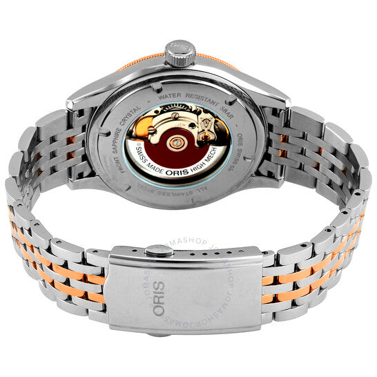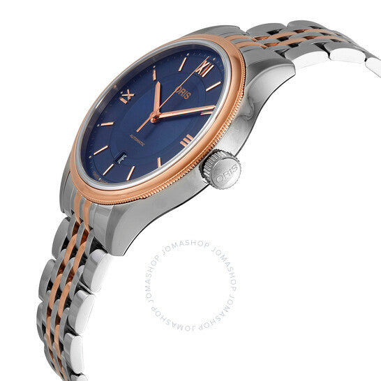 علبة من الفولاذ المقاوم للصدأ فضية اللون مع سوار من الفولاذ المقاوم للصدأ ثنائي اللون (فضي وذهبي وردي مطلي بتقنية PVD). إطار ثابت من الفولاذ المقاوم للصدأ مطلي بتقنية PVD باللون الذهبي الوردي. ميناء أزرق مع عقارب وعلامات ساعات باللون الذهبي الوردي. تظهر الأرقام الرومانية عند الساعة 3 و9 و12. علامات الدقائق حول الحافة الخارجية. نوع الميناء: تناظري. عقارب مضيئة. عرض التاريخ أعلى موضع الساعة 6. أوريس كاليبر 733، قاعدة SW 200-1 حركة أوتوماتيكية، مبنية على SW 200-1، تحتوي على 26 جوهرة، تنبض بمعدل 28800 ذبذبة في الساعة، ولديها احتياطي طاقة لمدة 38 ساعة تقريبًا. كريستال معدني مقاوم للخدش. تاج سحب/دفع. غطاء خلفي شفاف. شكل العلبة دائري، حجم العلبة: 42 مم. عرض السوار: 20 مم. مشبك قابل للطي. مقاومة للماء حتى عمق 50 مترًا / 165 قدمًا. الوظائف: التاريخ والساعة والدقيقة والثانية. سلسلة التاريخ الكلاسيكية. ساعة كاجوال. علامة الساعة: صناعة سويسرية. ساعة أوريس كلاسيك ديت أوتوماتيكية بمينا أزرق، 01 733 7719 4375-07 8 20 12.
