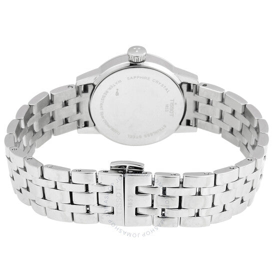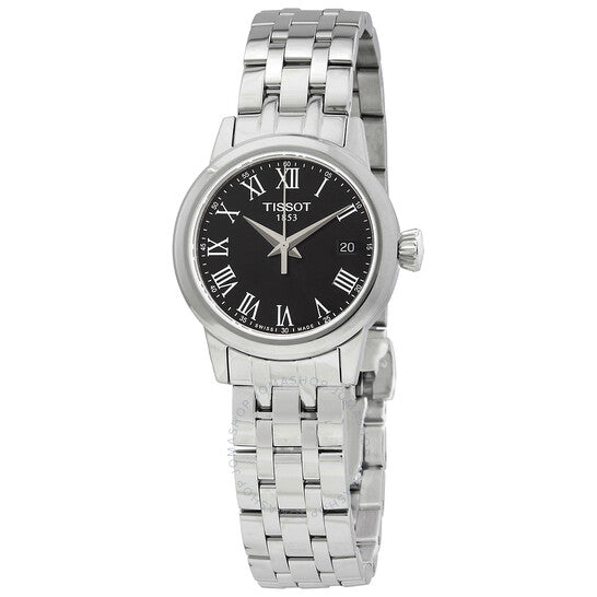 علبة وسوار من الفولاذ المقاوم للصدأ فضي اللون. إطار ثابت من الفولاذ المقاوم للصدأ فضي اللون. ميناء أسود بعقارب فضية اللون وعلامات ساعات بالأرقام الرومانية. علامات دقائق بالأرقام العربية (بفاصل 5 دقائق). نوع الميناء: تناظري. عرض التاريخ عند موضع الساعة 3. حركة كوارتز. زجاج ياقوت مقاوم للخدش. غطاء خلفي صلب. شكل العلبة دائري، مقاسها: 28 مم، سمكها: 7.1 مم. عرض السوار: 14 مم. مشبك قابل للطي مع مفتاح أمان. مقاومة للماء حتى عمق 50 مترًا / 165 قدمًا. الوظائف: التاريخ، الساعة، الدقيقة، الثانية. سلسلة كلاسيك دريم ليدي. طراز ساعة رسمية. علامة الساعة: صناعة سويسرية. ساعة تيسوت كلاسيك دريم ليدي كوارتز بمينا سوداء T129.210.11.053.00.