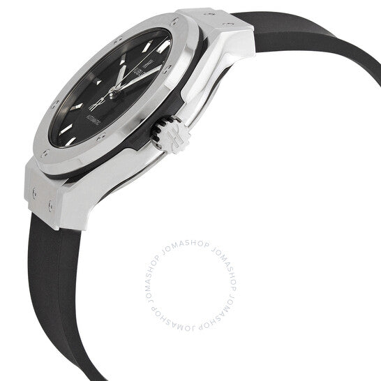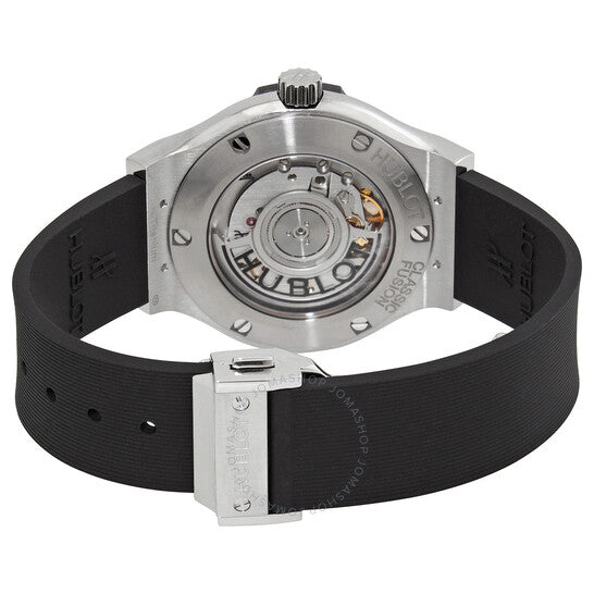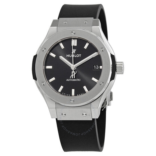 علبة تيتانيوم رمادية اللون مع سوار مطاطي أسود. إطار ثابت من التيتانيوم الرمادي. ميناء أسود بعقارب فضية اللون وعلامات ساعات. نوع الميناء: تناظري. عرض التاريخ عند موضع الساعة الثالثة. حركة هوبلو أوتوماتيكية من عيار HUB1110، مبنية على سيليتا SW300-1، تحتوي على 21 جوهرة، مكونة من 63 جزءًا، تنبض بمعدل 28800 ذبذبة في الساعة، ولديها احتياطي طاقة لمدة 42 ساعة تقريبًا. زجاج ياقوتي مقاوم للخدش. تاج قابل للسحب/الدفع. غطاء خلفي شفاف. شكل دائري. حجم العلبة: 38 مم. سمكها: 9 مم. مشبك قابل للطي. مقاومة للماء حتى عمق 50 مترًا / 165 قدمًا. الوظائف: التاريخ، الساعة، الدقيقة، الثانية. معلومات إضافية: العلبة الأصلية، دليل الاستخدام (ملحقات كاملة). سلسلة كلاسيك فيوجن. طراز ساعة فاخرة. ملصق الساعة: صناعة سويسرية. ساعة هوبلو كلاسيك فيوجن أوتوماتيكية بمينا سوداء 565.NX.1470.RX.