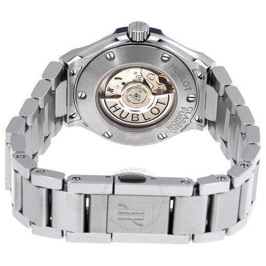 علبة من التيتانيوم مع سوار من التيتانيوم. إطار ثابت من التيتانيوم. ميناء أزرق بعقارب رمادية وعلامات ساعات. نوع الميناء: تناظري. عرض التاريخ عند موضع الساعة 3. حركة أوتوماتيكية من هوبلو، عيار HUB1120، مع احتياطي طاقة لمدة 40 ساعة. زجاج من الياقوت المقاوم للخدش. تاج قابل للسحب/الدفع. غطاء خلفي شفاف. شكل دائري. حجم العلبة: 33 مم. مشبك قابل للطي بزر ضغط. مقاومة للماء حتى عمق 50 مترًا / 165 قدمًا. الوظائف: التاريخ، الساعة، الدقيقة، الثانية. تصميم ساعة فاخر. علامة الساعة: صناعة سويسرية. ساعة هوبلو كلاسيك فيوجن أوتوماتيكية نسائية بمينا أزرق، 585.NX.7170.NX.