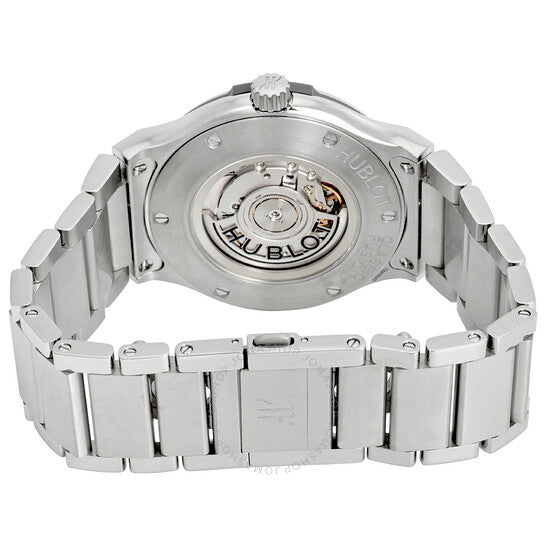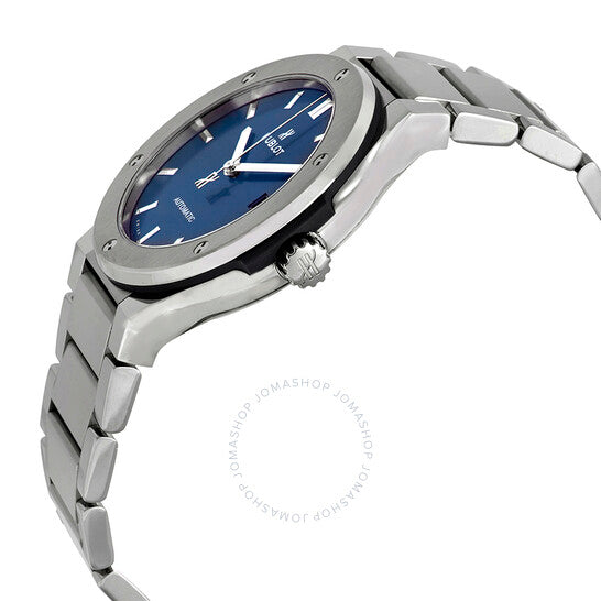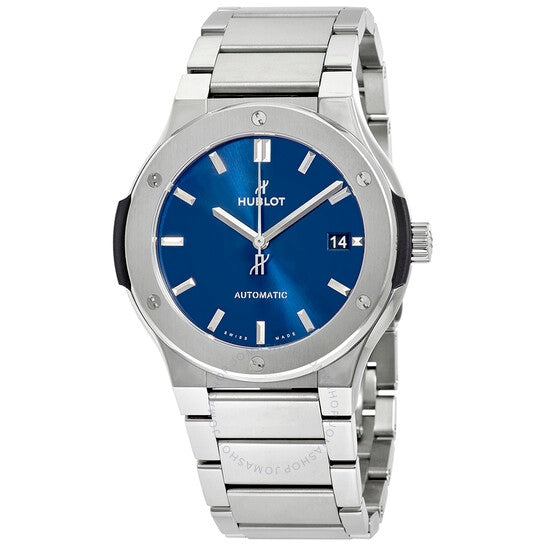 علبة تيتانيوم رمادية مع سوار تيتانيوم رمادي. إطار تيتانيوم رمادي ثابت. ميناء أزرق بعقارب رمادية وعلامات ساعات. نوع الميناء: تناظري. عرض التاريخ عند موضع الساعة الثالثة. حركة هوبلو أوتوماتيكية من عيار HUB1112، مبنية على سيليتا SW300-1، تحتوي على 25 جوهرة، مكونة من 63 جزءًا، تنبض بمعدل 28800 ذبذبة في الساعة، ولديها احتياطي طاقة لمدة 42 ساعة تقريبًا. زجاج ياقوتي مقاوم للخدش. تاج قابل للسحب/الدفع. غطاء خلفي شفاف. شكل دائري. حجم العلبة: 45 مم. مشبك قابل للطي بزر ضغط. مقاومة للماء حتى عمق 50 مترًا / 165 قدمًا. الوظائف: التاريخ، الساعة، الدقيقة، الثانية. سلسلة كلاسيك فيوجن. تصميم ساعة فاخرة. علامة الساعة: صناعة سويسرية. ساعة هوبلو كلاسيك فيوجن أوتوماتيكية للرجال بمينا أزرق 510.NX.7170.NX.