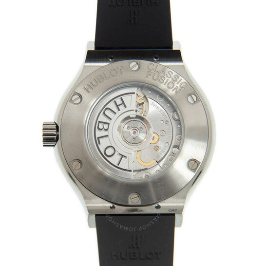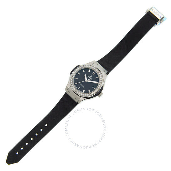 علبة تيتانيوم رمادية اللون مع سوار مطاطي أسود. إطار ثابت من التيتانيوم الرمادي مرصع بـ 36 ماسة (0.75 قيراط). عروة إطار من الراتنج المركب الأسود محصورة بين الإطار والعلبة. ميناء أسود بعقارب فضية اللون وعلامات ساعات. نوع الميناء: تناظري. عرض التاريخ عند موضع الساعة 3. حركة أوتوماتيكية من هوبلو، عيار HUB1120، تحتوي على 18 جوهرة، مكونة من 65 جزءًا، تنبض بسرعة 28800 ذبذبة في الساعة، ولديها احتياطي طاقة يصل إلى 40 ساعة تقريبًا. زجاج من الياقوت المقاوم للخدش. تاج قابل للسحب/الدفع. غطاء خلفي شفاف. شكل دائري. حجم العلبة: 33 مم. مشبك قابل للطي بزر ضغط. مقاومة للماء حتى عمق 50 مترًا / 165 قدمًا. الوظائف: التاريخ، الساعة، الدقيقة، الثانية. سلسلة كلاسيك فيوجن. تصميم ساعة فاخرة. علامة الساعة: صناعة سويسرية. ساعة هوبلو كلاسيك فيوجن أوتوماتيكية نسائية مرصعة بالألماس، 582.NX.1170.RX.1204.