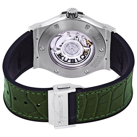 علبة من التيتانيوم المصقول بلمسة نهائية ساتانية، مع حزام مطاطي أسود، وسطح خارجي من جلد التمساح الأخضر. إطار ثابت من التيتانيوم المصقول. عروات إطار من الراتنج المركب الأسود محصورة بين الإطار والعلبة. ميناء أخضر مزين بنقش أشعة الشمس، مع عقارب فضية اللون وعلامات ساعات. نوع الميناء: تناظري. عرض التاريخ عند موضع الساعة الثالثة. حركة أوتوماتيكية من عيار هوبلو HUB1110، مبنية على سيليتا SW300-1، تحتوي على 21 جوهرة، مكونة من 63 جزءًا، بتردد 28800 ذبذبة في الساعة، ولديها احتياطي طاقة يدوم حوالي 42 ساعة. زجاج من الياقوت المقاوم للخدش. تاج قابل للسحب والدفع. غطاء خلفي شفاف. شكل العلبة دائري، مقاسها 42 مم. مشبك قابل للطي بزر ضغط. مقاومة للماء حتى عمق 50 مترًا / 165 قدمًا. الوظائف: التاريخ، الساعة، الدقيقة، الثانية. سلسلة كلاسيك فيوجن. تصميم ساعة فاخرة. علامة الساعة: صناعة سويسرية. ساعة هوبلو كلاسيك فيوجن أوتوماتيكية للرجال بمينا أخضر 542.NX.8970.LR.