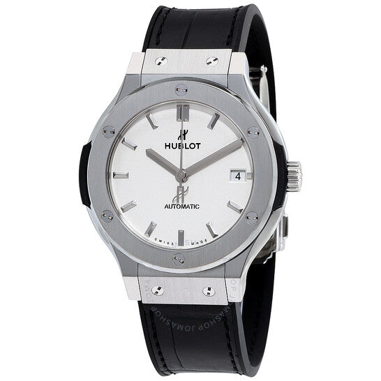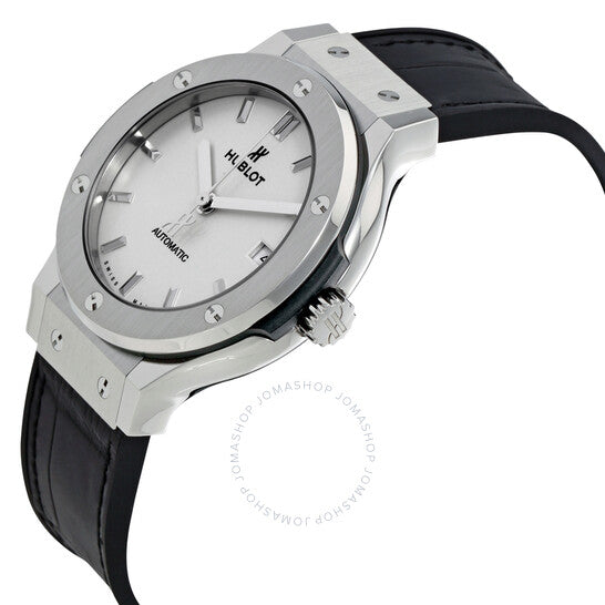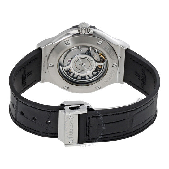 علبة تيتانيوم رمادية اللون مع سطح مطاطي من جلد التمساح الأسود المطرز. إطار ثابت من التيتانيوم الرمادي. عروة إطار من الراتنج المركب الأسود محصورة بين الإطار والعلبة. ميناء فضي لامع مع عقارب فضية اللون وعلامات ساعات. نوع الميناء: تناظري. عرض التاريخ عند موضع الساعة 3. حركة هوبلو كاليبر HUB1110 أوتوماتيكية، مبنية على سيليتا SW300-1، تحتوي على 21 جوهرة، مكونة من 63 جزءًا، تنبض بمعدل 28800 ذبذبة في الساعة، ولديها احتياطي طاقة لمدة 42 ساعة تقريبًا. زجاج ياقوتي مقاوم للخدش. تاج قابل للسحب/الدفع. غطاء خلفي شفاف. شكل دائري. حجم العلبة: 38 مم. عرض السوار: 20 مم. مشبك قابل للطي مع مفتاح أمان. مقاومة للماء حتى عمق 50 مترًا / 165 قدمًا. الوظائف: التاريخ، الساعة، الدقيقة، الثانية. سلسلة كلاسيك فيوجن. تصميم ساعة فاخرة. علامة الساعة: صناعة سويسرية. ساعة هوبلو كلاسيك فيوجن أوتوماتيكية للرجال 565.NX.2611.LR.