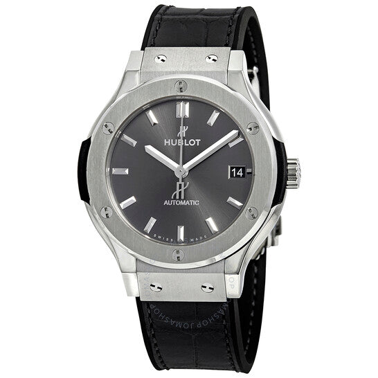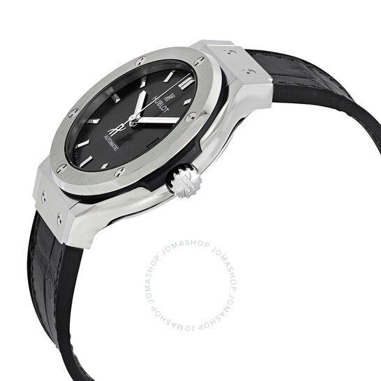 علبة تيتانيوم رمادية مع حزام جلد رمادي (جلد التمساح). إطار ثابت من التيتانيوم الرمادي. عروة إطار من الراتنج المركب الأسود. ميناء رمادي مع عقارب فضية اللون وعلامات ساعات. نوع الميناء: تناظري. عرض التاريخ عند موضع الساعة 3. حركة أوتوماتيكية من هوبلو، عيار HUB1110، مبنية على سيليتا SW300-1، تحتوي على 21 جوهرة، مكونة من 63 جزءًا، تنبض بمعدل 28800 ذبذبة في الساعة، ولديها احتياطي طاقة لمدة 42 ساعة تقريبًا. زجاج ياقوتي مقاوم للخدش. تاج قابل للسحب/الدفع. غطاء خلفي شفاف. شكل دائري. حجم العلبة: 38 مم. مشبك قابل للطي. مقاومة للماء حتى عمق 50 مترًا / 165 قدمًا. الوظائف: التاريخ، الساعة، الدقيقة، الثانية. سلسلة كلاسيك فيوجن. طراز ساعة رسمية. علامة الساعة: صناعة سويسرية. ساعة هوبلو كلاسيك فيوجن أوتوماتيكية من التيتانيوم للرجال 565.NX.7071.LR.