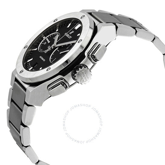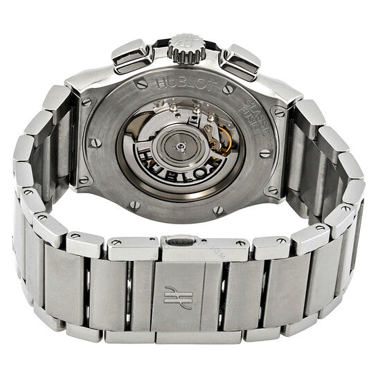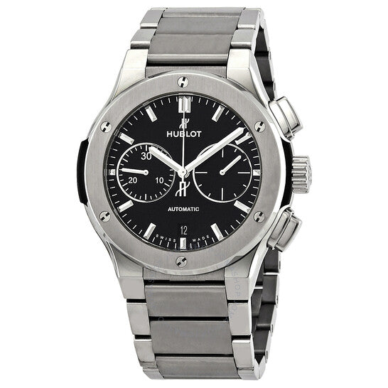 علبة من التيتانيوم الرمادي مع سوار من التيتانيوم الرمادي. إطار ثابت من التيتانيوم الرمادي. ميناء أسود بعقارب فضية اللون وعلامات ساعات. علامات دقائق حول الحافة الخارجية. نوع الميناء: تناظري. عرض التاريخ عند موضع الساعة السادسة. كرونوغراف - ميناءان فرعيان يعرضان: ٦٠ ثانية و٣٠ دقيقة. حركة أوتوماتيكية من هوبلو، عيار HUB1143، مبنية على ETA 2892-A2، تحتوي على ٥٩ جوهرة، تنبض بتردد ٢٨٨٠٠ ذبذبة في الساعة، ولديها احتياطي طاقة يقارب ٤٢ ساعة. زجاج من الياقوت المقاوم للخدش. تاج قابل للسحب/الدفع. غطاء خلفي شفاف. شكل دائري. حجم الهيكل: ٤٥ مم. مشبك قابل للطي بزر ضغط. مقاومة للماء حتى عمق ٥٠ مترًا / ١٦٥ قدمًا. الوظائف: كرونوغراف، تاريخ، ساعة، دقيقة، ثانية. سلسلة كلاسيك فيوجن. تصميم ساعة فاخر. علامة الساعة: صناعة سويسرية. ساعة هوبلو كلاسيك فيوجن كرونوغراف أوتوماتيكية للرجال 520.NX.1170.NX.