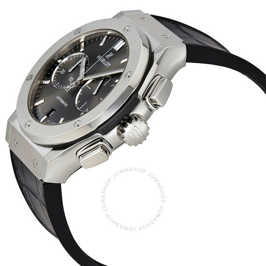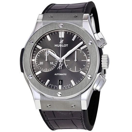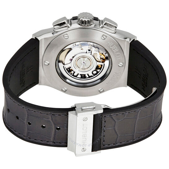 علبة من التيتانيوم الرمادي مع سوار مطاطي أسود، وسطح من جلد التمساح الرمادي (جلد التمساح) مطرز. إطار ثابت من التيتانيوم الرمادي. عروة إطار من الراتنج المركب الأسود محصورة بين الإطار والعلبة. ميناء رمادي بنقش أشعة الشمس مع عقارب فضية اللون وعلامات ساعات مؤشرة. علامات دقائق حول الحافة الخارجية. نوع الميناء: تناظري. عرض التاريخ عند موضع الساعة السادسة. كرونوغراف - ميناءان فرعيان يعرضان: ٦٠ ثانية و٣٠ دقيقة. حركة أوتوماتيكية من عيار هوبلو HUB1143، مبنية على ETA 2892-A2، تحتوي على ٥٩ جوهرة، تنبض بتردد ٢٨٨٠٠ ذبذبة في الساعة، وتتمتع باحتياطي طاقة يقارب ٤٢ ساعة. زجاج من الياقوت المقاوم للخدش. تاج قابل للسحب/الدفع. غطاء خلفي شفاف. شكل دائري. حجم العلبة: ٤٥ مم. عرض السوار: ٢٠ مم. مشبك قابل للطي بزر ضغط. مقاومة للماء حتى عمق ٥٠ مترًا / ١٦٥ قدمًا. الوظائف: كرونوغراف، تاريخ، ساعات، دقائق، ثوانٍ. سلسلة كلاسيك فيوجن. تصميم ساعة فاخر. علامة الساعة: صناعة سويسرية. ساعة هوبلو كلاسيك فيوجن كرونوغراف أوتوماتيكية للرجال 521.NX.7071.LR.
