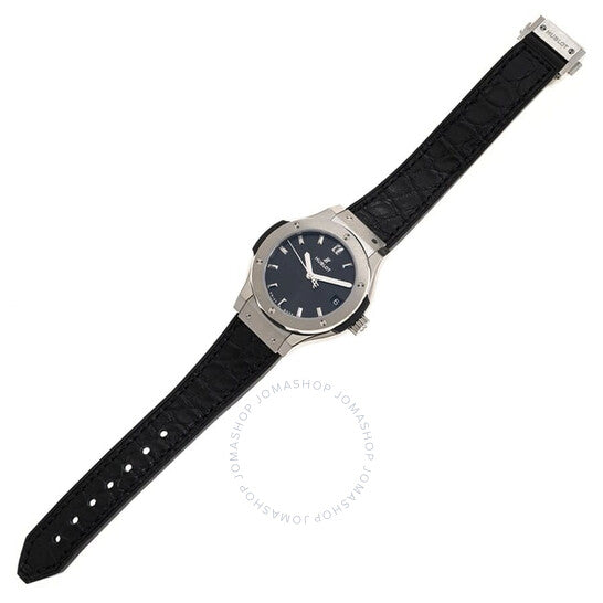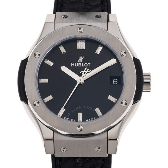 علبة من التيتانيوم الرمادي مع سوار أسود من جلد التمساح. إطار ثابت من التيتانيوم الرمادي. ميناء أسود بعقارب فضية اللون وعلامات ساعات. نوع الميناء: تناظري. عرض التاريخ عند موضع الساعة 3. حركة كوارتز. زجاج ياقوتي مقاوم للخدش. غطاء خلفي صلب. شكل العلبة دائري، مقاسها: 33 مم. مشبك قابل للطي بزر ضغط. الوظائف: التاريخ، الساعة، الدقائق، الثانية. معلومات إضافية: العلبة الأصلية، بطاقة ضمان دولية، دليل الاستخدام (ملحقات كاملة). سلسلة كلاسيك فيوجن. تصميم ساعة فاخرة. ملصق الساعة: صناعة سويسرية. ساعة هوبلو كلاسيك فيوجن كوارتز نسائية بمينا سوداء، 581.NX.1470.LR.
