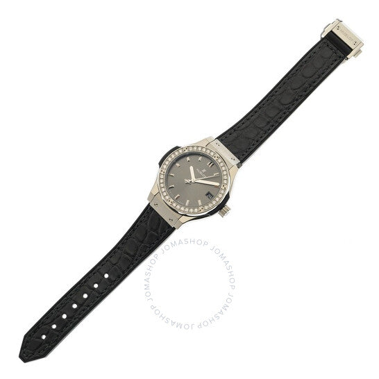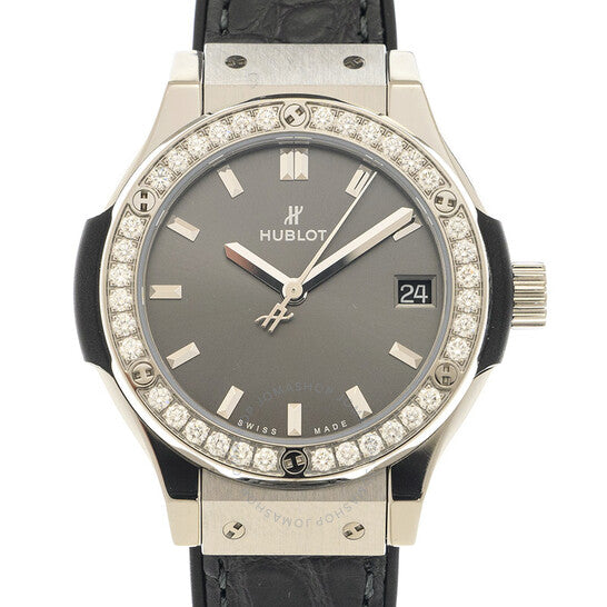 علبة من التيتانيوم مع سوار من جلد التمساح الرمادي والأسود وحزام مطاطي. إطار ثابت. ميناء رمادي مع عقارب فضية اللون وعلامات ساعات. نوع الميناء: تناظري. عرض التاريخ عند موضع الساعة 3. حركة كوارتز من هوبلو، عيار HUB2912. زجاج ياقوت مقاوم للخدش. تاج قابل للسحب/الدفع. غطاء خلفي صلب. شكل دائري، مقاس العلبة: 33 مم. مشبك قابل للطي. مقاومة للماء حتى عمق 50 مترًا / 150 قدمًا. الوظائف: التاريخ، الساعة، الدقائق، الثانية. معلومات إضافية: إطار مرصع بـ 36 ماسة (0.75 قيراط). سلسلة كلاسيك فيوجن. تصميم ساعة فاخرة. علامة الساعة: صناعة سويسرية. ساعة هوبلو كلاسيك فيوجن كوارتز نسائية بمينا رمادي، 581.nx.7071.lr.1104.
