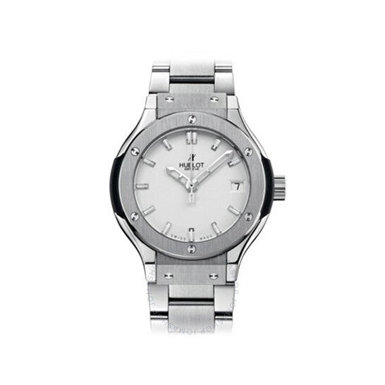 علبة من التيتانيوم فضية اللون مع سوار من التيتانيوم فضي اللون. إطار ثابت فضي اللون. ميناء أبيض أوبالين مع عقارب مطلية بالروديوم وعلامات ساعات. نوع الميناء: تناظري. عرض التاريخ عند موضع الساعة 3. حركة كوارتز. زجاج ياقوت مقاوم للخدش. تاج قابل للسحب/الدفع. شكل العلبة دائري. حجم العلبة: 33 مم. إبزيم قابل للطي بزر ضغط. مقاومة للماء حتى عمق 50 مترًا / 165 قدمًا. الوظائف: التاريخ، الساعة، الدقيقة، الثانية. تصميم ساعة فاخرة. علامة الساعة: صناعة سويسرية. ساعة هوبلو كلاسيك فيوجن كوارتز نسائية 585.NX.2610.NX.