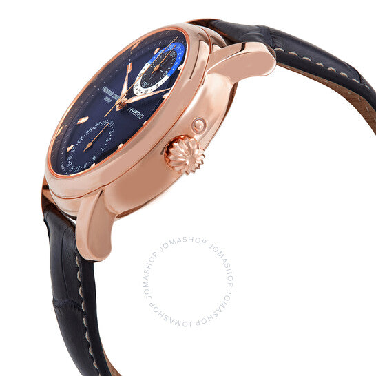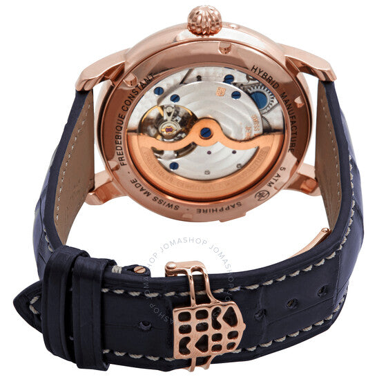 علبة من الفولاذ المقاوم للصدأ مطلية بالذهب الوردي بتقنية PVD مع حزام من جلد التمساح البحري. إطار ثابت من الفولاذ المقاوم للصدأ مطلي بالذهب الوردي بتقنية PVD. ميناء أزرق مع عقارب على شكل ألفا وعلامات ساعات مؤشرة بلون الذهب الوردي. علامات دقائق حول الحافة الخارجية. نوع الميناء: تناظري. عقارب وعلامات مضيئة. ميناءان فرعيان يعرضان: التاريخ و24 ساعة / 1/100 ثانية. حركة أوتوماتيكية من عيار فريدريك كونستانت FC-750، تحتوي على 33 جوهرة، تنبض بسرعة 28800 ذبذبة في الساعة، ولديها احتياطي طاقة لمدة 42 ساعة تقريبًا. كريستال ياقوت مقاوم للخدش. تاج على شكل بصلة للسحب / الدفع. غطاء خلفي شفاف. شكل دائري، حجم العلبة: 42 مم. عرض السوار: 22 مم. مشبك تانغ. مقاومة للماء حتى عمق 50 مترًا / 165 قدمًا. الوظائف: التاريخ، الساعة، الدقيقة، الثانية، 24 ساعة، توقيت غرينتش، مراقبة النوم، إشعارات الاهتزاز / الصوت / تتبع النشاط. سلسلة هجينة كلاسيكية. نمط ساعة فاخرة. علامة الساعة: صناعة سويسرية. ساعة فريدريك كونستانت الكلاسيكية الهجينة الأوتوماتيكية للرجال بمينا أزرق FC-750N4H4.