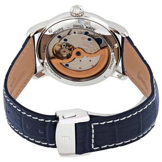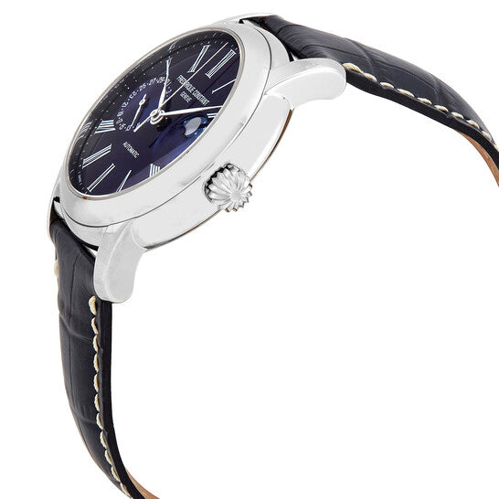 علبة من الفولاذ المقاوم للصدأ مع سوار أزرق من جلد العجل بنقش جلد التمساح. إطار ثابت من الفولاذ المقاوم للصدأ. ميناء أزرق بعقارب فضية اللون على شكل ورقة شجر وعلامات ساعات رومانية. علامات دقائق حول الحافة الخارجية. نوع الميناء: تناظري. ميناء فرعي للتاريخ. شاشتان لعرض التاريخ وطور القمر. حركة أوتوماتيكية من عيار فريدريك كونستانت FC-712، تحتوي على 28 جوهرة، تنبض بتردد 28800 ذبذبة في الساعة، ولديها احتياطي طاقة يدوم حوالي 38 ساعة. زجاج من الياقوت المقاوم للخدش. تاج قابل للسحب/الدفع. غطاء خلفي شفاف. شكل دائري. حجم العلبة: 42 مم. سمك العلبة: 11 مم. عرض السوار: 22 مم. مشبك قابل للطي. مقاومة للماء حتى عمق 50 مترًا / 165 قدمًا. الوظائف: التاريخ، الساعة، الدقيقة، الثانية، طور القمر. سلسلة كلاسيكية. تصميم ساعة فاخرة. علامة الساعة: صناعة سويسرية. ساعة فريدريك كونستانت كلاسيك مون فيز أوتوماتيكية بمينا أزرق للرجال FC-712MN4H6.