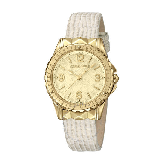علبة من الفولاذ المقاوم للصدأ بلون ذهبي مع سوار جلدي بيج. إطار ثابت من الفولاذ المقاوم للصدأ بلون ذهبي. ميناء بلون الشمبانيا مع عقارب ذهبية اللون وعلامات ساعات بأرقام عربية. علامات دقائق حول الحافة الخارجية. نوع الميناء: تناظري. حركة كوارتز روندا 763. زجاج ياقوتي مقاوم للخدش. شكل العلبة دائري. حجم العلبة: 34 مم. مشبك بإبزيم. مقاومة للماء حتى عمق 50 مترًا / 165 قدمًا. وظائف الساعة: الساعات، الدقائق، الثواني. ساعة أنيقة. ساعة روبرتو كافالي الكلاسيكية كوارتز بمينا بلون الشمبانيا للسيدات RV1L048L0036.