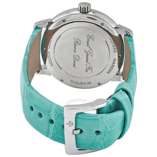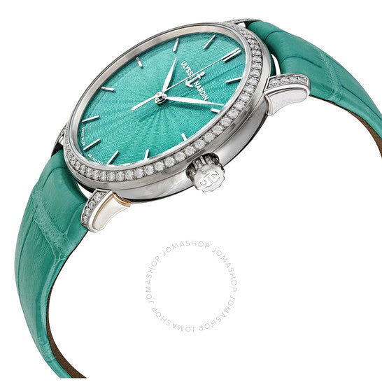 علبة من الذهب الأبيض عيار ١٨ قيراطًا مع سوار من جلد التمساح الأخضر. إطار ثابت من الذهب الأبيض عيار ١٨ قيراطًا مرصع بالألماس. ميناء أخضر بعقارب بيضاء وعلامات ساعات. نوع الميناء: تناظري. حركة أوتوماتيكية من أوليس ناردين كاليبر UN-٨١٥ مع احتياطي طاقة ٤٢ ساعة. زجاج من الياقوت المقاوم للخدش. تاج لولبي. غطاء خلفي صلب. شكل دائري. حجم العلبة: ٣٧ مم. مشبك بإبزيم. مقاومة للماء حتى عمق ٣٠ مترًا / ١٠٠ قدم. الوظائف: التاريخ، الساعات، الدقائق، الثواني، الكرونومتر. طراز ساعة رسمية. علامة الساعة: صناعة سويسرية. ساعة أوليس ناردين كلاسيكو ليدي أوتوماتيكية كرونومتر نسائية مرصعة بالألماس بمينا أخضر ٨١٥٠-٢٠١BC/E٨.