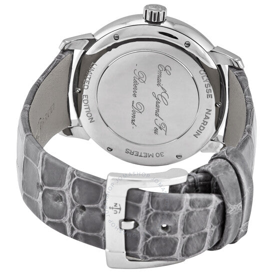 علبة من الذهب الأبيض عيار ١٨ قيراطًا مع سوار من جلد التمساح الرمادي. إطار ثابت من الذهب الأبيض عيار ١٨ قيراطًا مرصع بالألماس. ميناء رمادي بعقارب بيضاء وعلامات ساعات. نوع الميناء: تناظري. حركة أوتوماتيكية من أوليس ناردين كاليبر UN-٨١٥ مع احتياطي طاقة ٤٢ ساعة. زجاج من الياقوت المقاوم للخدش. تاج لولبي. غطاء خلفي صلب. شكل دائري. حجم العلبة: ٣٧ مم. عرض السوار: ١٨ مم. مشبك تانغ. مقاومة للماء حتى عمق ٣٠ مترًا / ١٠٠ قدم. الوظائف: التاريخ، الساعات، الدقائق، الثواني، الكرونومتر. طراز ساعة رسمية. علامة الساعة: صناعة سويسرية. ساعة أوليس ناردين كلاسيكو ليدي غراند فو أوتوماتيكية كرونومتر مرصعة بالألماس، مينا رمادية للنساء، ٨١٥٠-٢٠١BC/E١.