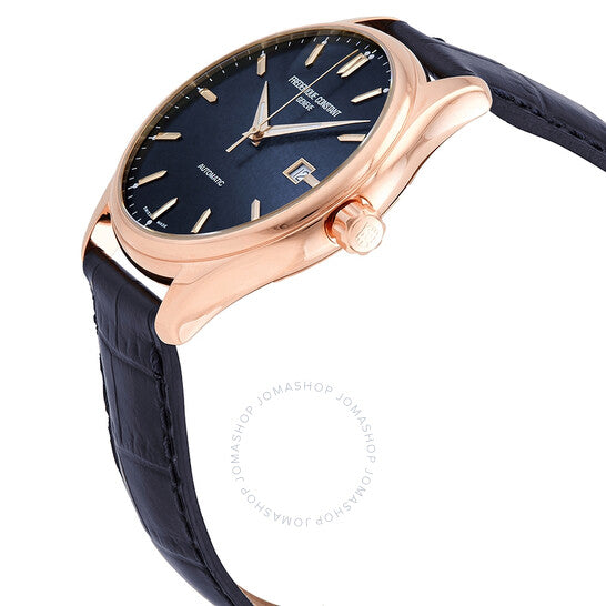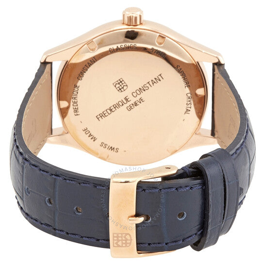 علبة من الفولاذ المقاوم للصدأ مطلية بالذهب الوردي مع سوار جلدي أزرق. إطار ثابت من الفولاذ المقاوم للصدأ مطلي بالذهب الوردي. ميناء أزرق مع عقارب مضيئة على شكل دوفين بلون الذهب الوردي وعلامات ساعات مؤشرة. علامات دقائق حول الحافة الخارجية. نوع الميناء: تناظري. عقارب وعلامات مضيئة. عرض التاريخ عند موضع الساعة 3. حركة أوتوماتيكية من عيار فريدريك كونستانت FC-303، مبنية على سيليتا SW200-1، تحتوي على 26 جوهرة، تنبض بمعدل 28800 ذبذبة في الساعة، ولديها احتياطي طاقة لمدة 38 ساعة تقريبًا. كريستال ياقوت مقاوم للخدش. تاج قابل للسحب/الدفع. غطاء خلفي صلب. شكل دائري، حجم العلبة: 40 مم، سمك العلبة: 10.3 مم. عرض السوار: 20 مم. مشبك بإبزيم دبوسي. مقاومة للماء حتى عمق 50 مترًا / 165 قدمًا. الوظائف: التاريخ، الساعة، الدقائق، الثواني. تصميم ساعة كاجوال. ملصق الساعة: صناعة سويسرية. ساعة فريدريك كونستانت كلاسيكس أوتوماتيكية للرجال بمينا أزرق FC-303N5B4.