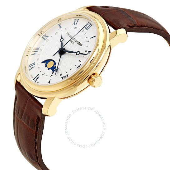 علبة من الفولاذ المقاوم للصدأ مطلية بالذهب الأصفر مع سوار من الجلد البني. إطار ثابت من الفولاذ المقاوم للصدأ مطلي بالذهب الأصفر. ميناء فضي مع عقارب زرقاء على شكل بريجيه وعلامات ساعات بالأرقام الرومانية. مقياس التاريخ (مؤشر التاريخ) حول حلقة داخلية. نوع الميناء: تناظري. ميناء فرعي واحد يعرض: طور القمر. حركة أوتوماتيكية من عيار فريدريك كونستانت FC-330، تحتوي على 26 جوهرة، تنبض بسرعة 28800 ذبذبة في الساعة، ولديها احتياطي طاقة لمدة 38 ساعة تقريبًا. زجاج ياقوت مقاوم للخدش. تاج سحب/دفع. غطاء خلفي صلب. شكل دائري، حجم العلبة: 40 مم، سمك العلبة: 10 مم. عرض السوار: 20 مم. مشبك تانغ. مقاومة للماء حتى عمق 60 مترًا / 200 قدم. الوظائف: التاريخ، الساعة، الدقيقة، الثانية، طور القمر. معلومات إضافية: حركة أوتوماتيكية ذاتية التعبئة - خيار صديق للبيئة للعميل المميز. مدعومة بحركة ذراعك اليومية. سلسلة كلاسيكس. تصميم ساعة فاخرة. علامة الساعة: صناعة سويسرية. ساعة فريدريك كونستانت كلاسيكس أوتوماتيكية للرجال FC-330MC4P5.