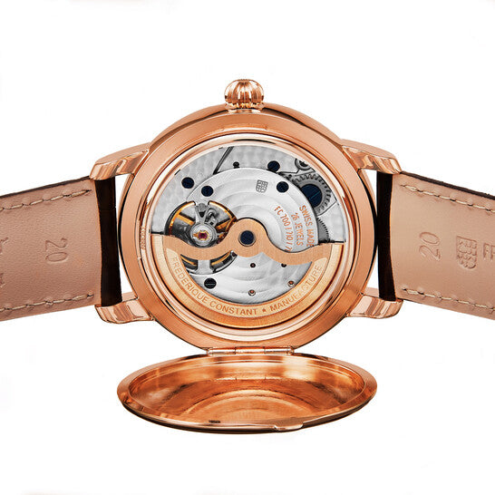 علبة من الفولاذ المقاوم للصدأ مطلية بالذهب الوردي مع سوار من جلد التمساح البني الداكن. إطار ثابت مطلي بالذهب الوردي. ميناء فضي بعقارب سوداء وعلامات ساعات رومانية. علامات دقائق حول الحافة الخارجية. نوع الميناء: تناظري. نافذة عرض التاريخ عند موضع الساعة السادسة. ميناء فرعي لعرض التاريخ/أطوار القمر. حركة أوتوماتيكية من عيار فريدريك كونستانت FC-715 مع احتياطي طاقة لمدة 42 ساعة. زجاج ياقوت مقاوم للخدش. تاج لولبي. غطاء خلفي شفاف قابل للطي. شكل دائري. حجم العلبة: 40.5 مم. سمكها: 12.4 مم. عرض السوار: 20 مم، طوله: 8 بوصات. مقاومة للماء حتى عمق 30 مترًا / 100 قدم. الوظائف: التاريخ، الساعة، الدقيقة، الثانية، أطوار القمر. معلومات إضافية: مناسبة للرش، المطر الخفيف؛ غير مناسبة للسباحة أو الغوص. طراز ساعة رسمية. علامة الساعة: صناعة سويسرية. ساعة فريدريك كونستانت كلاسيكس أوتوماتيكية للرجال بمينا فضي FC-715MC4H4.