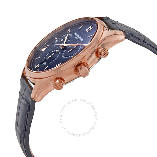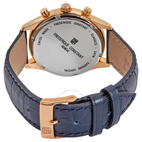 علبة من الفولاذ المقاوم للصدأ مطلية بالذهب الوردي مع سوار جلدي أزرق. إطار ثابت مطلي بالذهب الوردي. ميناء أزرق بعقارب على شكل أوراق شجر بلون الذهب الوردي، وأرقام رومانية متناوبة وعلامات ساعات. علامات دقائق حول الحافة الخارجية. نوع الميناء: تناظري. عرض التاريخ عند موضع الساعة السادسة. كرونوغراف - ثلاثة أقراص فرعية تعرض: ٦٠ ثانية، ٣٠ دقيقة، و١٢ ساعة. حركة كوارتز من عيار فريدريك كونستانت FC-292. زجاج ياقوت مقاوم للخدش. تاج قابل للسحب/الدفع. غطاء خلفي صلب. شكل دائري. حجم الهيكل: ٤٠ مم. سمك الهيكل: ١٠.٢ مم. عرض السوار: ٢٠ مم. مشبك تانغ. مقاومة للماء حتى عمق ٥٠ مترًا / ١٦٥ قدمًا. الوظائف: كرونوغراف، تاريخ، ساعة، دقيقة، ثانية. طراز ساعة رياضية. ملصق الساعة: صناعة سويسرية. ساعة فريدريك كونستانت كلاسيكس كرونوغراف كوارتز للرجال بمينا زرقاء FC-292MN5B4.