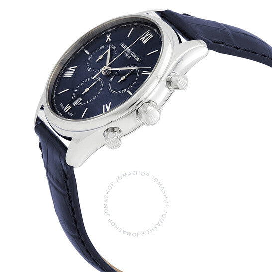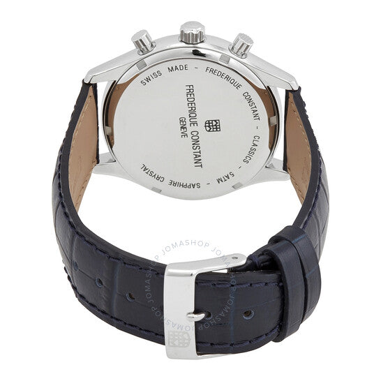 علبة فضية اللون من الفولاذ المقاوم للصدأ مع سوار جلدي أزرق. إطار ثابت فضي اللون من الفولاذ المقاوم للصدأ. ميناء أزرق بعقارب فضية اللون على شكل ورقة شجر، وأرقام رومانية متناوبة وعلامات ساعات. علامات دقائق حول الحافة الخارجية. نوع الميناء: تناظري. عرض التاريخ عند موضع الساعة 3. كرونوغراف - ثلاثة أقراص فرعية تعرض: 60 ثانية، 30 دقيقة، و12 ساعة. حركة كوارتز عيار فريدريك كونستانت FC-292. زجاج ياقوت مقاوم للخدش. تاج قابل للسحب/الدفع. غطاء خلفي صلب. شكل دائري، حجم العلبة: 40 مم، سمكها: 10.2 مم. عرض السوار: 20 مم. مشبك تانغ. مقاومة للماء حتى عمق 30 مترًا / 100 قدم. الوظائف: كرونوغراف، تاريخ، ساعة، دقيقة، ثانية. تصميم كاجوال. علامة الساعة: صناعة سويسرية. ساعة فريدريك كونستانت كلاسيكس كرونوغراف كوارتز للرجال بمينا زرقاء FC-292MN5B6.