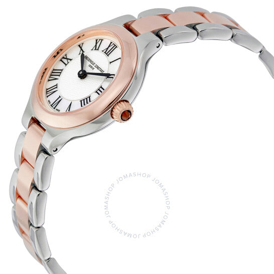 علبة من الفولاذ المقاوم للصدأ بسوار من الفولاذ المقاوم للصدأ ثنائي اللون (فضي وذهبي وردي). إطار ثابت مطلي بالذهب الوردي. ميناء من عرق اللؤلؤ (مزخرف بنقش غيوشيه) مع عقارب سوداء على شكل سيف وعلامات ساعات بأرقام رومانية. نوع الميناء: تناظري. حركة كوارتز من عيار فريدريك كونستانت FC-200. زجاج من الياقوت المقاوم للخدش. تاج قابل للدفع والسحب. غطاء خلفي صلب. شكل دائري. حجم العلبة: 28 مم. سمكها: 8 مم. عرض السوار: 13 مم. مشبك قابل للطي. مقاومة للماء حتى عمق 30 مترًا / 100 قدم. الوظائف: ساعة، دقيقة. طراز ساعة رسمية. علامة الساعة: صناعة سويسرية. إصدارات المنتج: FC 200M1ER32B، FC.200M1ER32B، FC200M1ER32B. ساعة فريدريك كونستانت كلاسيكس ديلايت النسائية FC-200M1ER32B.