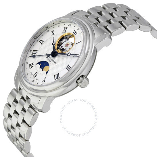 علبة من الفولاذ المقاوم للصدأ مع سوار من الفولاذ المقاوم للصدأ. إطار ثابت من الفولاذ المقاوم للصدأ. ميناء فضي (قلب مفتوح) بعقارب سوداء على طراز بريجيه وعلامات ساعات بأرقام رومانية. مقياس تاريخ حول الحافة الخارجية. نوع الميناء: تناظري. مؤشر للتاريخ. عرض أطوار القمر. حركة أوتوماتيكية من عيار فريدريك كونستانت FC-335، مبنية على سيليتا SW200-1، تحتوي على 26 جوهرة، تنبض بتردد 28800 ذبذبة في الساعة، ولديها احتياطي طاقة لمدة 38 ساعة تقريبًا. زجاج ياقوتي مقاوم للخدش. تاج قابل للسحب/الدفع. غطاء خلفي شفاف. شكل دائري. حجم العلبة: 40 مم. سمكها: 10 مم. عرض السوار: 22 مم. مشبك قابل للطي بزر ضغط. مقاومة للماء حتى عمق 60 مترًا / 200 قدم. الوظائف: التاريخ، الساعة، الدقيقة، الثانية، أطوار القمر. سلسلة أطوار القمر الكلاسيكية. طراز ساعة فاخرة. علامة الساعة: صناعة سويسرية. إصدارات مختلفة من المنتج: FC 335MC4P6B2، FC335MC4P6B2، FC335MC4P6B2. ساعة فريدريك كونستانت كلاسيكس مون فايز الأوتوماتيكية للرجال، FC-335MC4P6B2.
