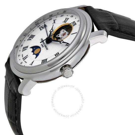 علبة من الفولاذ المقاوم للصدأ مع سوار جلدي أسود. إطار ثابت من الفولاذ المقاوم للصدأ. ميناء فضي (قلب مفتوح) بعقارب سوداء على طراز بريجيه وعلامات ساعات بأرقام رومانية. مقياس تاريخ حول الحافة الخارجية. نوع الميناء: تناظري. عرض التاريخ حول الحافة الخارجية. عرض أطوار القمر. حركة أوتوماتيكية من عيار فريدريك كونستانت FC-335، مبنية على سيليتا SW200-1، تحتوي على 26 جوهرة، تنبض بمعدل 28800 ذبذبة في الساعة، ولديها احتياطي طاقة لمدة 38 ساعة تقريبًا. زجاج ياقوت مقاوم للخدش. تاج قابل للسحب/الدفع. غطاء خلفي شفاف. شكل دائري. حجم العلبة: 40 مم. سمك العلبة: 10 مم. عرض السوار: 22 مم. طول السوار: 8 بوصات. مشبك تانغ. مقاومة للماء حتى عمق 60 مترًا / 200 قدم. الوظائف: التاريخ، الساعة، الدقيقة، الثانية، أطوار القمر. سلسلة أطوار القمر الكلاسيكية. طراز ساعة فاخرة. ملصق الساعة: صناعة سويسرية. إصدارات المنتج: FC 335MC4P6، FC.335MC4P6، FC335MC4P6. ساعة فريدريك كونستانت الكلاسيكية للرجال بمراحل القمر FC-335MC4P6.