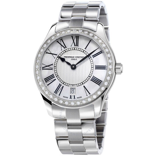 علبة من الفولاذ المقاوم للصدأ مع سوار من الفولاذ المقاوم للصدأ. إطار ثابت من الفولاذ المقاوم للصدأ مرصع بـ 40 ماسة. ميناء من عرق اللؤلؤ بعقارب سوداء وعلامات ساعات رومانية. علامات دقائق حول حلقة داخلية. نوع الميناء: تناظري. عرض التاريخ عند موضع الساعة السادسة. حركة كوارتز من عيار فريدريك كونستانت FC-220. زجاج ياقوت مقاوم للخدش. تاج لولبي. غطاء خلفي صلب. شكل دائري. حجم العلبة: 36 مم. مشبك مخفي. مقاومة للماء حتى عمق 50 مترًا / 165 قدمًا. الوظائف: التاريخ، الساعة، الدقائق. سلسلة كلاسيكس. طراز ساعة فاخرة. علامة الساعة: صناعة سويسرية. ساعة فريدريك كونستانت كلاسيكس كوارتز نسائية مرصعة بالألماس FC-220MPW3BD6B.