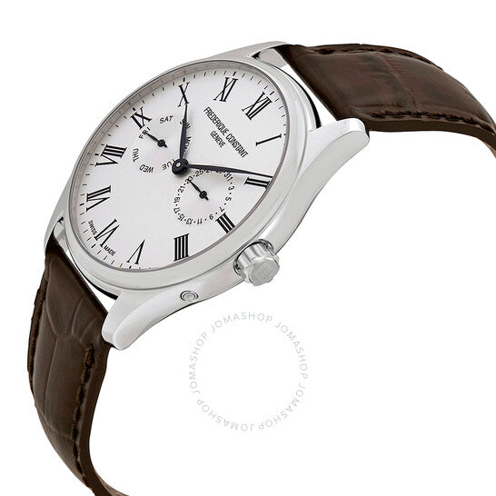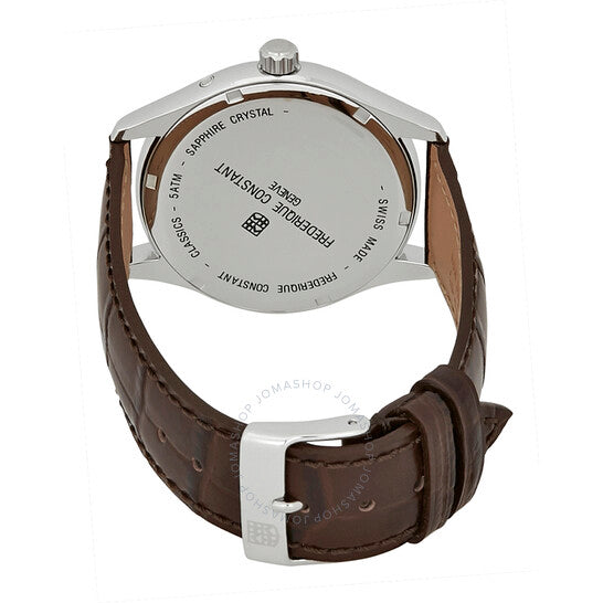 علبة من الفولاذ المقاوم للصدأ فضية اللون مع سوار جلدي بني. إطار ثابت من الفولاذ المقاوم للصدأ فضي اللون. ميناء فضي اللون مع عقارب فضية اللون وعلامات ساعات رومانية. نوع الميناء: تناظري. عرض التاريخ عند موضع الساعة 3. ميناءان فرعيان لعرض التاريخ وأيام الأسبوع. آلية حركة كوارتز. زجاج ياقوتي مقاوم للخدش. غطاء خلفي صلب. حجم العلبة: 40 مم. شكلها دائري. عرض السوار: 20 مم. مقاومة للماء حتى عمق 50 مترًا / 165 قدمًا. الوظائف: التاريخ، اليوم، الساعة، الدقيقة، الثانية. طراز ساعة رسمية. علامة الساعة: صناعة سويسرية. ساعة فريدريك كونستانت كلاسيكس للرجال بمينا فضي وجلد بني، FC-259WR5B6-BN.