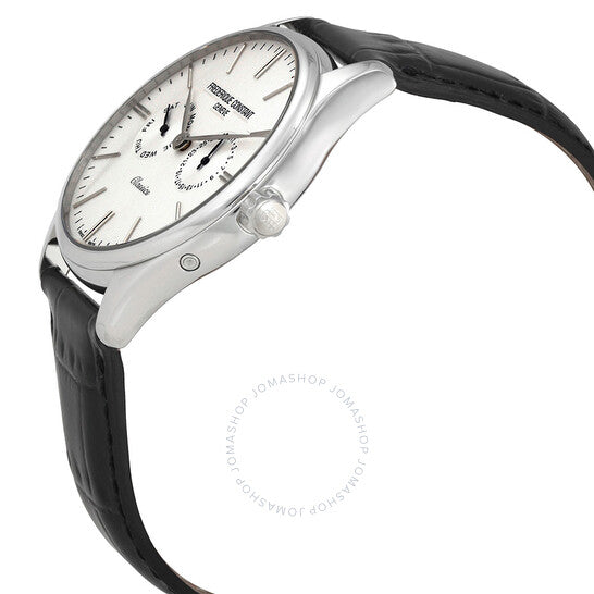 علبة من الفولاذ المقاوم للصدأ مع سوار جلدي أسود. إطار ثابت من الفولاذ المقاوم للصدأ. ميناء فضي (مزخرف بنقشة باريس) بعقارب فضية اللون وعلامات ساعات. علامات دقائق حول الحافة الخارجية. نوع الميناء: تناظري. ميناءان فرعيان يعرضان التاريخ ويوم الأسبوع. حركة كوارتز FC-259 مع احتياطي طاقة يدوم 25 شهرًا. حجم العلبة: 40 مم. شكل العلبة دائري. مقاومة للماء حتى عمق 50 مترًا / 165 قدمًا. الوظائف: التاريخ، اليوم، الساعة، الدقيقة، الثانية. طراز ساعة رسمية. ساعة فريدريك كونستانت كلاسيكس كوارتز للرجال بمينا فضي ومؤشر لليوم/التاريخ، FC-259ST5B6.