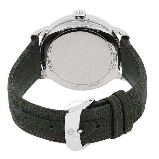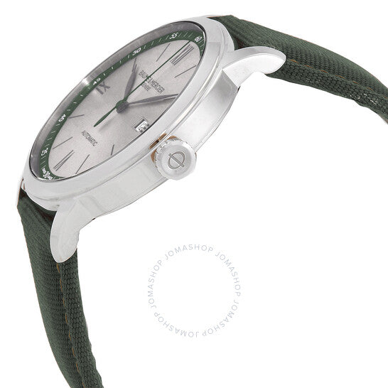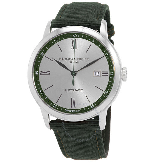 علبة فضية اللون من الفولاذ المقاوم للصدأ مع سوار قماش أخضر. إطار ثابت فضي اللون من الفولاذ المقاوم للصدأ. ميناء أخضر بعقارب سوداء وعلامات ساعات رومانية ومؤشرية. علامات دقائق حول الحافة الخارجية. نوع الميناء: تناظري. عرض التاريخ عند موضع الساعة 3. حركة أوتوماتيكية. غطاء خلفي صلب. شكل العلبة دائري، مقاسها: 42 مم. مشبك بإبزيم. مقاومة للماء حتى عمق 50 مترًا / 165 قدمًا. الوظائف: التاريخ، الساعة، الدقائق، الثواني. سلسلة كلاسيما. تصميم كاجوال. علامة الساعة: صناعة سويسرية. ساعة بوم إيه ميرسييه كلاسيما أوتوماتيكية للرجال بمينا أخضر، طراز M0A10696.