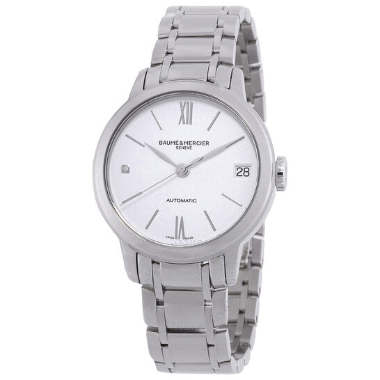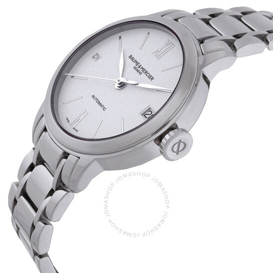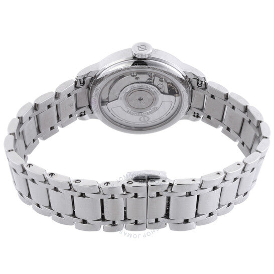 علبة وسوار من الفولاذ المقاوم للصدأ فضي اللون. إطار ثابت فضي اللون. ميناء فضي اللون مع عقارب فضية اللون وأرقام رومانية وعلامات ساعات. نوع الميناء: تناظري. عرض التاريخ عند موضع الساعة 3. حركة أوتوماتيكية باحتياطي طاقة لمدة 42 ساعة. زجاج ياقوت مقاوم للخدش. تاج لولبي. غطاء خلفي شفاف. شكل العلبة دائري، مقاسها: 31 مم، سمكها: 8.20 مم. مشبك قابل للطي. مقاومة للماء حتى عمق 50 مترًا / 165 قدمًا. الوظائف: التاريخ، الساعة، الدقيقة، الثانية. سلسلة كلاسيما. اسم الساعة: صناعة سويسرية. ساعة بوم إيه ميرسييه كلاسيما أوتوماتيكية نسائية بمينا فضي، طراز M0A10312.