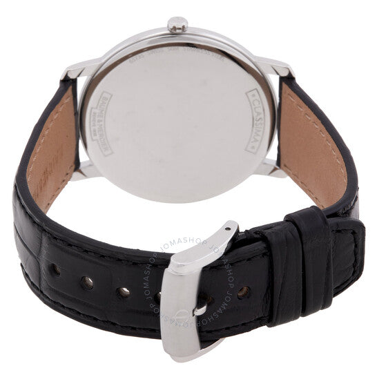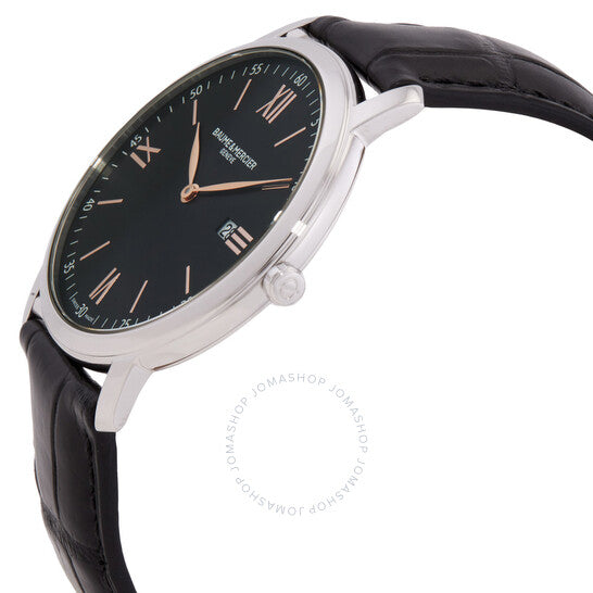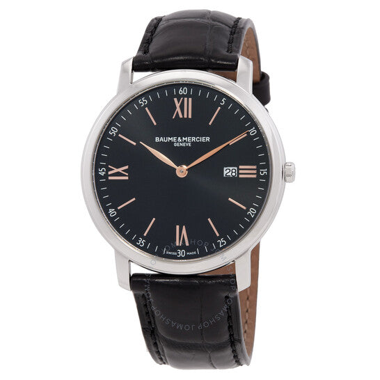 علبة من الفولاذ المقاوم للصدأ فضية اللون مع سوار جلدي أسود. إطار ثابت من الفولاذ المقاوم للصدأ فضي اللون. ميناء أسود بعقارب ذهبية وردية ومؤشرات ساعات بأرقام رومانية. نوع الميناء: تناظري. عرض التاريخ عند موضع الساعة 3. آلية حركة كوارتز. زجاج ياقوتي مقاوم للخدش. تاج قابل للسحب/الدفع. غطاء خلفي صلب. شكل دائري، مقاس العلبة: 39 مم، سمكها: 5.5 مم. عرض السوار: 20 مم. مشبك بإبزيم. مقاومة للماء حتى عمق 50 مترًا / 165 قدمًا. الوظائف: التاريخ، الساعة، الدقائق، الثواني. سلسلة كلاسيما. تصميم كاجوال. علامة الساعة: صناعة سويسرية. ساعة بوم إيه ميرسييه كلاسيما كوارتز سوداء للرجال، طراز M0A10127.