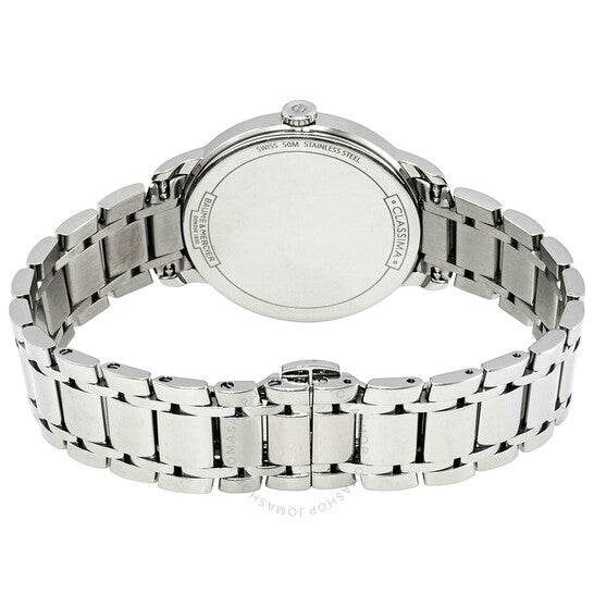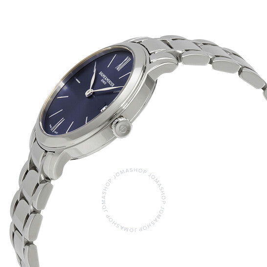 علبة من الفولاذ المقاوم للصدأ مع سوار من الفولاذ المقاوم للصدأ. إطار ثابت من الفولاذ المقاوم للصدأ. ميناء أزرق بعقارب مطلية بالروديوم على شكل ورقة شجر ومؤشرات ساعات. أرقام رومانية تُشير إلى موضعي الساعة 6 و12. نوع الميناء: تناظري. عرض التاريخ عند موضع الساعة 3. حركة كوارتز روندا عيار 704. كريستال ياقوت مقاوم للخدش. تاج قابل للسحب/الدفع. غطاء خلفي صلب. شكل دائري. حجم العلبة: 31 مم. سُمكها: 5.95 مم. مشبك فراشة. مقاومة للماء حتى عمق 50 مترًا / 165 قدمًا. الوظائف: التاريخ، الساعة، الدقائق. سلسلة كلاسيما. طراز ساعة رسمية. علامة الساعة: صناعة سويسرية. ساعة بوم إيه ميرسييه كلاسيما كوارتز نسائية بمينا زرقاء 10477.