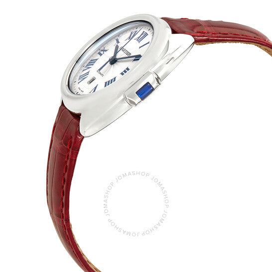 علبة من الفولاذ المقاوم للصدأ مع سوار من جلد التمساح (بوردو). إطار ثابت من الفولاذ المقاوم للصدأ. ميناء فضي مطلي بتقنية فلينك، بعقارب على شكل سيف من الفولاذ المزرق، وعلامات ساعات رومانية زرقاء. علامات دقائق حول الحافة الخارجية. نوع الميناء: تناظري. نافذة عرض التاريخ فوق موضع الساعة السادسة. حركة أوتوماتيكية من كارتييه، عيار 1847 إم سي، تحتوي على 23 جوهرة، تنبض بتردد 28800 ذبذبة في الساعة، ولديها احتياطي طاقة يدوم حوالي 42 ساعة. زجاج من الياقوت المقاوم للخدش. تاج من الكابوشون. غطاء خلفي صلب. شكل دائري. حجم العلبة: 31 مم. سمكها: 11.04 مم. مشبك قابل للطي. مقاومة للماء حتى عمق 30 مترًا / 100 قدم. الوظائف: التاريخ، الساعة، الدقائق، الثواني. سلسلة كلي دو كارتييه. طراز ساعة رسمية. علامة الساعة: صناعة سويسرية. ساعة كارتييه كلي دو كارتييه أوتوماتيكية بمينا فضي للسيدات WSCL0016.
