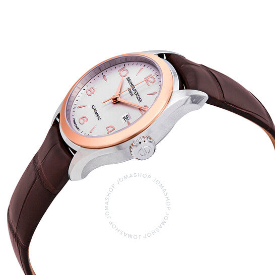 علبة من الفولاذ المقاوم للصدأ مع سوار من جلد التمساح البني. إطار ثابت من الذهب الوردي عيار 18 قيراطًا. ميناء فضي بعقارب بلون الذهب الوردي، وأرقام عربية وعلامات ساعات متناوبة. علامات دقائق حول الحافة الخارجية. نوع الميناء: تناظري. عرض التاريخ عند موضع الساعة 3. حركة أوتوماتيكية من عيار ETA 2671 مع احتياطي طاقة لمدة 38 ساعة. زجاج من الياقوت المقاوم للخدش. تاج لولبي. غطاء خلفي شفاف. شكل دائري. حجم العلبة: 30 مم. سمكها: 9.94 مم. عرض السوار: 15 مم. مشبك تانغ. مقاومة للماء حتى عمق 50 مترًا / 165 قدمًا. الوظائف: التاريخ، الساعة، الدقائق، الثواني. سلسلة كليفتون. تصميم ساعة فاخرة. علامة الساعة: صناعة سويسرية. ساعة بوم إيه ميرسييه كليفتون أوتوماتيكية نسائية بمينا فضي، 10208.