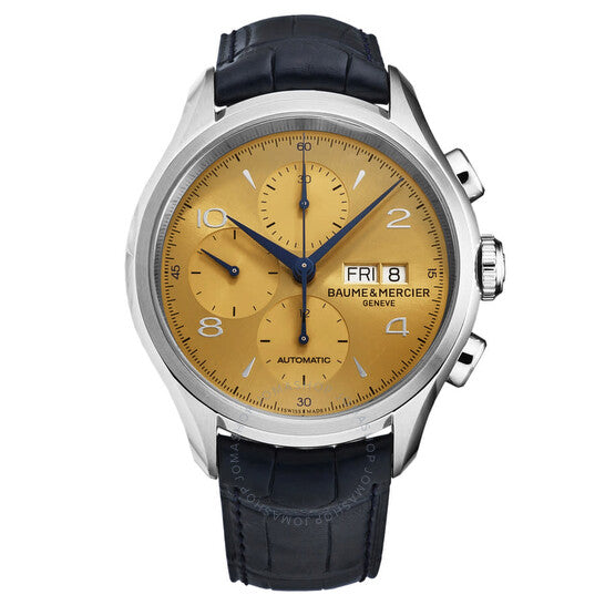 علبة فضية اللون من الفولاذ المقاوم للصدأ مع سوار جلدي أزرق. إطار ثابت فضي اللون من الفولاذ المقاوم للصدأ. ميناء بلون الشمبانيا بعقارب زرقاء وأرقام عربية وعلامات ساعات. علامات دقائق حول الحافة الخارجية. نوع الميناء: تناظري. عرض اليوم/التاريخ. آلية حركة أوتوماتيكية. زجاج ياقوت مقاوم للخدش. تاج قابل للسحب/الدفع. غطاء خلفي شفاف. شكل العلبة دائري، مقاسها: 43 مم، سمكها: 14.95 مم. عرض السوار: 21 مم، طوله: 8 بوصات. مشبك قابل للطي بزر ضغط. مقاومة للماء حتى عمق 50 مترًا / 165 قدمًا. الوظائف: كرونوغراف، عرض اليوم، التاريخ، الساعة، الدقيقة، الثانية. معلومات إضافية: الساعات، الدقائق، الثواني الصغيرة، عرض اليوم/التاريخ، الكرونوغراف. سلسلة كليفتون. تصميم ساعة فاخرة. علامة الساعة: صناعة سويسرية. ساعة بوم إيه ميرسييه كليفتون كرونوغراف أوتوماتيكية للرجال بمينا بلون الشمبانيا، طراز M0A10240.