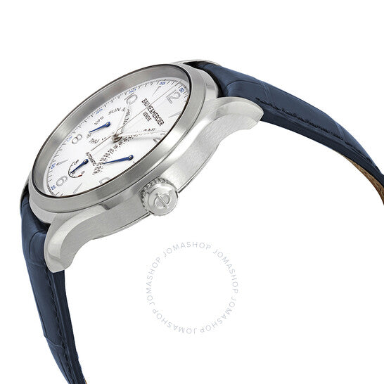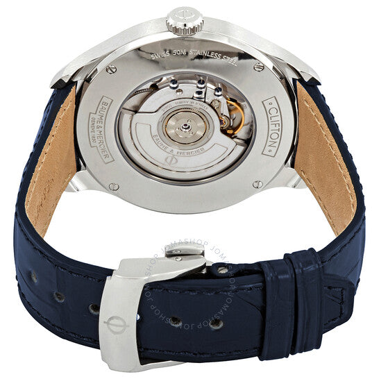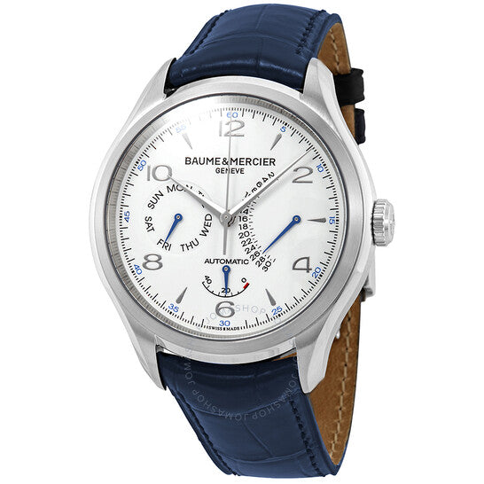 علبة من الفولاذ المقاوم للصدأ مع سوار أزرق من جلد التمساح. إطار ثابت من الفولاذ المقاوم للصدأ. ميناء أبيض بعقارب فضية اللون على شكل دوفين، ومؤشرات ساعات متناوبة بأرقام عربية. علامات دقائق حول الحافة الخارجية. نوع الميناء: تناظري. ثلاثة مؤشرات لعرض التاريخ (ارتجاعي)، ويوم الأسبوع، واحتياطي الطاقة. حركة أوتوماتيكية من عيار Soprod 9094 باحتياطي طاقة لمدة 42 ساعة. زجاج من الياقوت المقاوم للخدش. تاج قابل للسحب/الدفع. غطاء خلفي شفاف. شكل دائري. حجم العلبة: 43 مم. سمكها: 12.05 مم. عرض السوار: 20 مم. مشبك قابل للطي بزر ضغط. مقاومة للماء حتى عمق 50 مترًا / 165 قدمًا. الوظائف: تاريخ ارتجاعي، ساعة، دقيقة، ثانية، احتياطي طاقة. معلومات إضافية: 30 ياقوتة. تصميم ساعة كاجوال. علامة الساعة: صناعة سويسرية. ساعة بوم إيه ميرسييه كليفتون ريتروجريد أوتوماتيكية للرجال بمينا بيضاء، 10449.