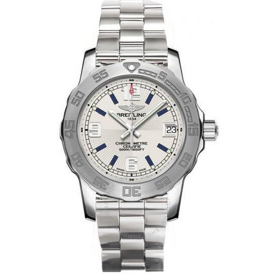 علبة من الفولاذ المقاوم للصدأ مع سوار من الفولاذ المقاوم للصدأ. إطار دوار أحادي الاتجاه من الفولاذ المقاوم للصدأ. ميناء فضي اللون بعقارب فضية اللون ومؤشرات ساعات مضيئة. أرقام عربية تُشير إلى الساعات 6 و9 و12. مؤشرات دقائق حول الحافة الخارجية. نوع الميناء: تناظري. عقارب ومؤشرات مضيئة. عرض التاريخ عند الساعة 3. آلية حركة سوبر كوارتز. زجاج ياقوت مقاوم للخدش. تاج مُغلق ببرغي. غطاء خلفي صلب. حجم العلبة: 33 مم. سُمكها: 11.6 مم. شكلها دائري. عرض السوار: 16 مم. مشبك قابل للطي. مقاومة للماء حتى عمق 500 متر / 1650 قدمًا. الوظائف: التاريخ، الساعة، الدقائق، الثواني. تصميم ساعة فاخرة. علامة الساعة: صناعة سويسرية. ساعة بريتلينغ كولت 33 النسائية بمينا فضي A7738711-G762SS.
