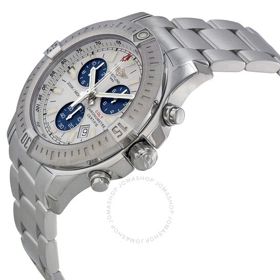 علبة من الفولاذ المقاوم للصدأ مع سوار من الفولاذ المقاوم للصدأ. إطار دوار أحادي الاتجاه من الفولاذ المقاوم للصدأ. ميناء فضي بعقارب مضيئة وعلامات ساعات ومؤشرات دقيقة. مقياس سرعة الدوران حول الحافة الخارجية. نوع الميناء: تناظري. عقارب وعلامات مضيئة. عرض التاريخ بين موضعي الساعة الرابعة والخامسة. كرونوغراف - ثلاثة أقراص فرعية زرقاء تعرض: ٦٠ ثانية، ١٢ ساعة، وعُشر الثانية. حركة كوارتز. كريستال ياقوت مقاوم للخدش. تاج مُغلق ببرغي. غطاء خلفي صلب. قطر العلبة: ٤٤ مم. شكل دائري. عرض السوار: ٢٠ مم / ٢٢ مم. مشبك قابل للطي. مقاومة للماء حتى عمق ٣٠٠ متر / ١٠٠٠ قدم. الوظائف: كرونوغراف، مقياس سرعة الدوران، التاريخ، الساعة، الدقيقة، الثانية. طراز ساعة فاخرة. علامة الساعة: صناعة سويسرية. ساعة بريتلينغ كولت كرونوغراف للرجال بمينا فضي وستانلس ستيل، A7338811-G790SS.