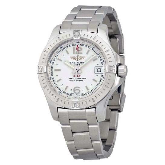 علبة وسوار من الفولاذ المقاوم للصدأ فضي اللون. إطار دوار أحادي الاتجاه من الفولاذ المقاوم للصدأ فضي اللون. ميناء فضي ستراتوس مع عقارب ومؤشرات ساعات فضية اللون. أرقام عربية تُشير إلى موضعي الساعة 6 و12. علامات الدقائق. علامات 1/100 حول الحافة الخارجية. نوع الميناء: تناظري. عقارب ومؤشرات مضيئة. عرض التاريخ عند موضع الساعة 3. حركة كوارتز بريتلينغ كاليبر 77. كريستال ياقوتي مقاوم للخدش. قفل ببرغي - تاج بحشوتين. غطاء خلفي صلب. شكل دائري، حجم العلبة: 33 مم، سمكها: 9.1 مم. عرض السوار: 16 مم، طول السوار: 8.5 بوصة. مشبك قابل للطي. مقاومة للماء حتى عمق 200 متر / 660 قدم. الوظائف: التاريخ، الساعة، الدقيقة، الثانية، الكرونومتر. معلومات إضافية: مؤشر نهاية العمر. سلسلة كولت. تصميم ساعة فاخرة. ملصق الساعة: صناعة سويسرية. ساعة بريتلينج كولت كوارتز كرونومتر للسيدات A7738811/G793.175A.