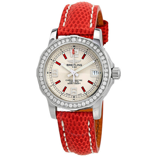 علبة من الفولاذ المقاوم للصدأ فضية اللون مع سوار من جلد السحلية الأحمر. إطار ثابت مرصع بالألماس. ميناء فضي مع عقارب فضية اللون وأرقام عربية للساعات. مقياس دقائق حول الحافة الداخلية. نوع الميناء: تناظري. عقارب وعلامات مضيئة. عرض التاريخ عند موضع الساعة 3. حركة كوارتز. زجاج ياقوتي مقاوم للخدش. شكل العلبة دائري. حجمها: 33 مم. مشبك تانغ. مقاومة للماء حتى عمق 500 متر / 1650 قدمًا. الوظائف: التاريخ، الساعة، الدقائق، الثواني. طراز ساعة الغوص. علامة الساعة: صناعة سويسرية. ساعة بريتلينغ كولت النسائية بمينا فضي وجلد السحلية A7738753-G761RDZT.