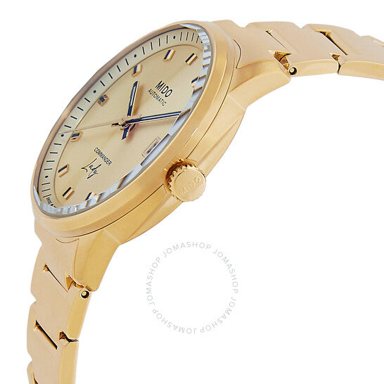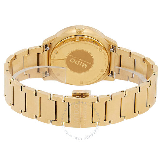 علبة وسوار من الفولاذ المقاوم للصدأ مطليان بالذهب الأصفر بتقنية PVD. إطار ثابت من الفولاذ المقاوم للصدأ مطلي بالذهب الأصفر بتقنية PVD. ميناء بلون الشمبانيا مع عقارب وعلامات ساعات ذهبية اللون. علامات دقائق حول الحافة الخارجية. نوع الميناء: تناظري. عرض التاريخ عند موضع الساعة 3. حركة أوتوماتيكية مع احتياطي طاقة لمدة 72 ساعة. زجاج من الياقوت المقاوم للخدش. تاج قابل للسحب/الدفع. شكل العلبة دائري، مقاسها: 35 مم، سمكها: 9.2 مم. عرض السوار: 19 مم. مشبك قابل للطي. مقاومة للماء حتى عمق 50 مترًا / 165 قدمًا. الوظائف: التاريخ، الساعة، الدقائق، الثواني. سلسلة كوماندر ليدي. تصميم كاجوال. علامة الساعة: صناعة سويسرية. تنوعات المنتج: M0212073302100. ساعة ميدو كوماندر ليدي أوتوماتيكية بمينا بلون الشمبانيا، M021.207.33.021.00.