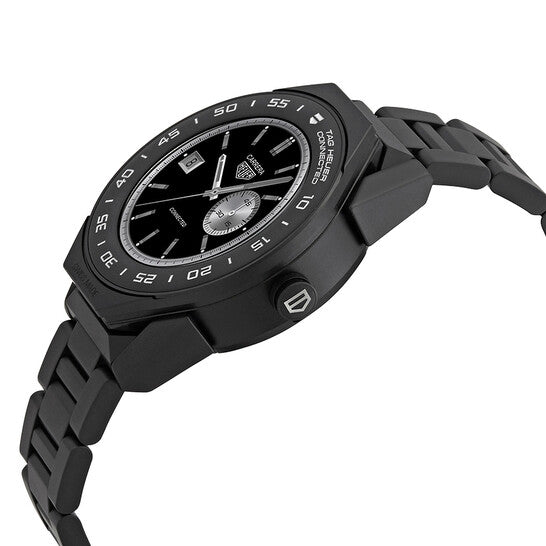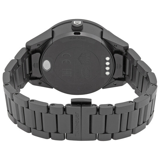 علبة من التيتانيوم الأسود المصقول بالرمل بتقنية PVD، مع سوار من السيراميك الأسود. إطار من السيراميك المصقول بالرمل. ميناء رقمي. مؤشرات للدقائق حول الحافة الخارجية. نوع الميناء: رقمي. حركة كوارتز. زجاج ياقوت مقاوم للخدش. هيكل دائري، مقاسه: 41 مم، سُمكه: 13.2 مم. مقاومة للماء حتى عمق 50 مترًا/165 قدمًا. الوظائف: كرونوغراف، تاريخ، ساعات، دقائق، ثوانٍ، منبه، مؤقت، نظام تحديد المواقع العالمي (GPS)، مقياس تسارع، جيروسكوب مع خاصية كشف الميل، مستشعر إضاءة محيطية، ميكروفون، ميزة دفع بتقنية NFC، متوافقة مع تطبيق تاغ هوير للهواتف الذكية المتصلة. معلومات إضافية: دقة الشاشة: 390 × 390. ذاكرة رئيسية 1 جيجابايت مع ذاكرة تخزين 8 جيجابايت. اتصال بلوتوث 4.1 - WLAN 2.4 جيجاهرتز 802.11 b/g/n. معالج Intel Atom. علامة الساعة: صناعة سويسرية. ساعة تاغ هوير الذكية الرقمية للرجال من السيراميك SBF818100.80BH0616.