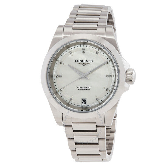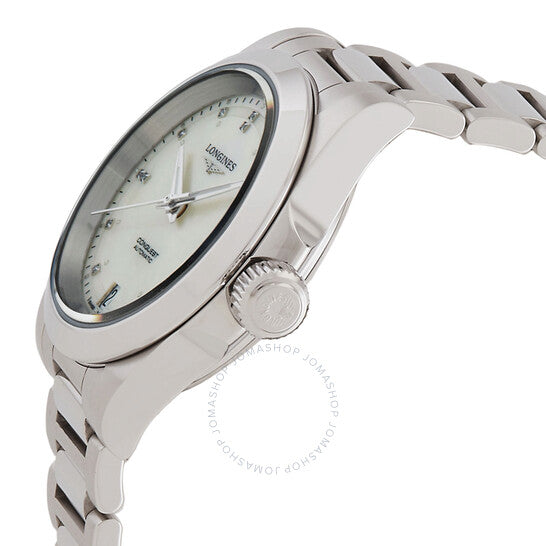 علبة وسوار من الفولاذ المقاوم للصدأ بلون فضي. إطار ثابت من الفولاذ المقاوم للصدأ بلون فضي. ميناء من عرق اللؤلؤ مع عقارب فضية اللون وعلامات ساعات من الألماس. علامات دقائق حول الحافة الخارجية. نوع الميناء: تناظري. عرض التاريخ عند موضع الساعة السادسة. حركة لونجين كاليبر L888 أوتوماتيكية، مبنية على ETA A31.L11، تحتوي على 21 جوهرة، تنبض بمعدل 25200 ذبذبة في الساعة، ولديها احتياطي طاقة لمدة 64 ساعة تقريبًا. زجاج من الياقوت المقاوم للخدش. تاج لولبي. شكل العلبة دائري، مقاسها 34 مم. مشبك قابل للطي مع مفتاح أمان. مقاومة للماء حتى عمق 100 متر / 330 قدمًا. الوظائف: التاريخ، الساعة، الدقيقة، الثانية. معلومات إضافية: العلبة الأصلية، بطاقة الضمان الدولية، دليل الاستخدام (ملحقات كاملة). سلسلة كونكويست. طراز ساعة فاخرة. ملصق الساعة: صناعة سويسرية. ساعة لونجين كونكويست أوتوماتيكية مرصعة بالألماس للسيدات L3.430.4.87.6.