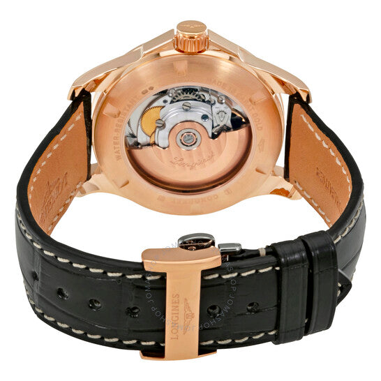علبة من الذهب الوردي عيار ١٨ قيراطًا مع سوار من الجلد الأسود. إطار ثابت من الذهب الوردي عيار ١٨ قيراطًا. ميناء فضي اللون مع عقارب ومؤشرات ساعات من الذهب الوردي. أرقام عربية تُشير إلى موضعي الساعة ٦ و١٢. مؤشرات دقائق حول الحافة الخارجية. نوع الميناء: تناظري. مؤشرات مضيئة. عرض التاريخ عند موضع الساعة ٣. حركة أوتوماتيكية من عيار لونجين L633 مع احتياطي طاقة لمدة ٣٨ ساعة. زجاج ياقوت مقاوم للخدش. تاج لولبي. غطاء خلفي شفاف. حجم العلبة: ٣٩ مم. سُمكها: ١١.٥ مم. شكلها دائري. إبزيم قابل للطي بزر ضغط. مقاومة للماء حتى عمق ٣٠٠ متر / ١٠٠٠ قدم. الوظائف: التاريخ، الساعة، الدقيقة، الثانية. تصميم ساعة فاخرة. علامة الساعة: صناعة سويسرية. ساعة لونجين كونكويست الأوتوماتيكية للرجال L3.676.8.76.3.