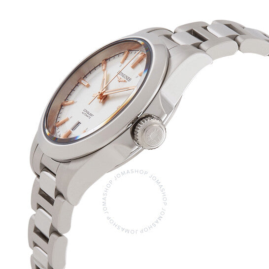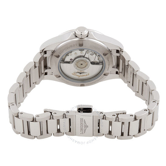 علبة وسوار من الفولاذ المقاوم للصدأ فضي اللون. إطار ثابت من الفولاذ المقاوم للصدأ فضي اللون. ميناء فضي اللون مع عقارب ومؤشرات ساعات ذهبية اللون. مقياس دقائق حول الحافة الداخلية. نوع الميناء: تناظري. عقارب ومؤشرات مضيئة. عرض التاريخ عند موضع الساعة السادسة. حركة أوتوماتيكية. كريستال ياقوت مقاوم للخدش. تاج لولبي. غطاء خلفي شفاف. شكل العلبة دائري، مقاسها: 30 مم، سمكها: 9.7 مم. مشبك قابل للطي مع مفتاح أمان. الوظائف: التاريخ، الساعة، الدقائق، الثواني. سلسلة كونكويست. طراز ساعة رسمية. علامة الساعة: صناعة سويسرية. ساعة لونجين كونكويست أوتوماتيكية نسائية بمينا فضي L33204726.